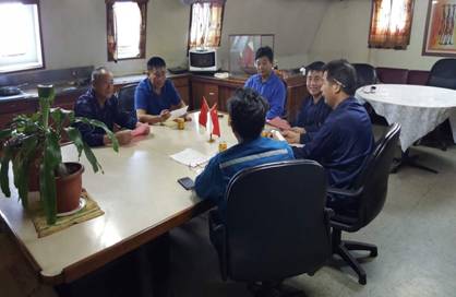 2017年8月25日,因转载、修理等原因在马绍尔马祖罗港的lojet轮、金汇58轮和开创102轮党员在lojet轮小餐厅召开了一次“两学一做”专题组织生活会,党员船长海上副指挥严斌、党员总轮机长陈树江也一起参加了会议。按照党员发展要求,入党积极分子、lojet轮船长於玉宏也应邀参加。严斌作为金汇18和金汇58轮联合党支部支部书记主持了会议。