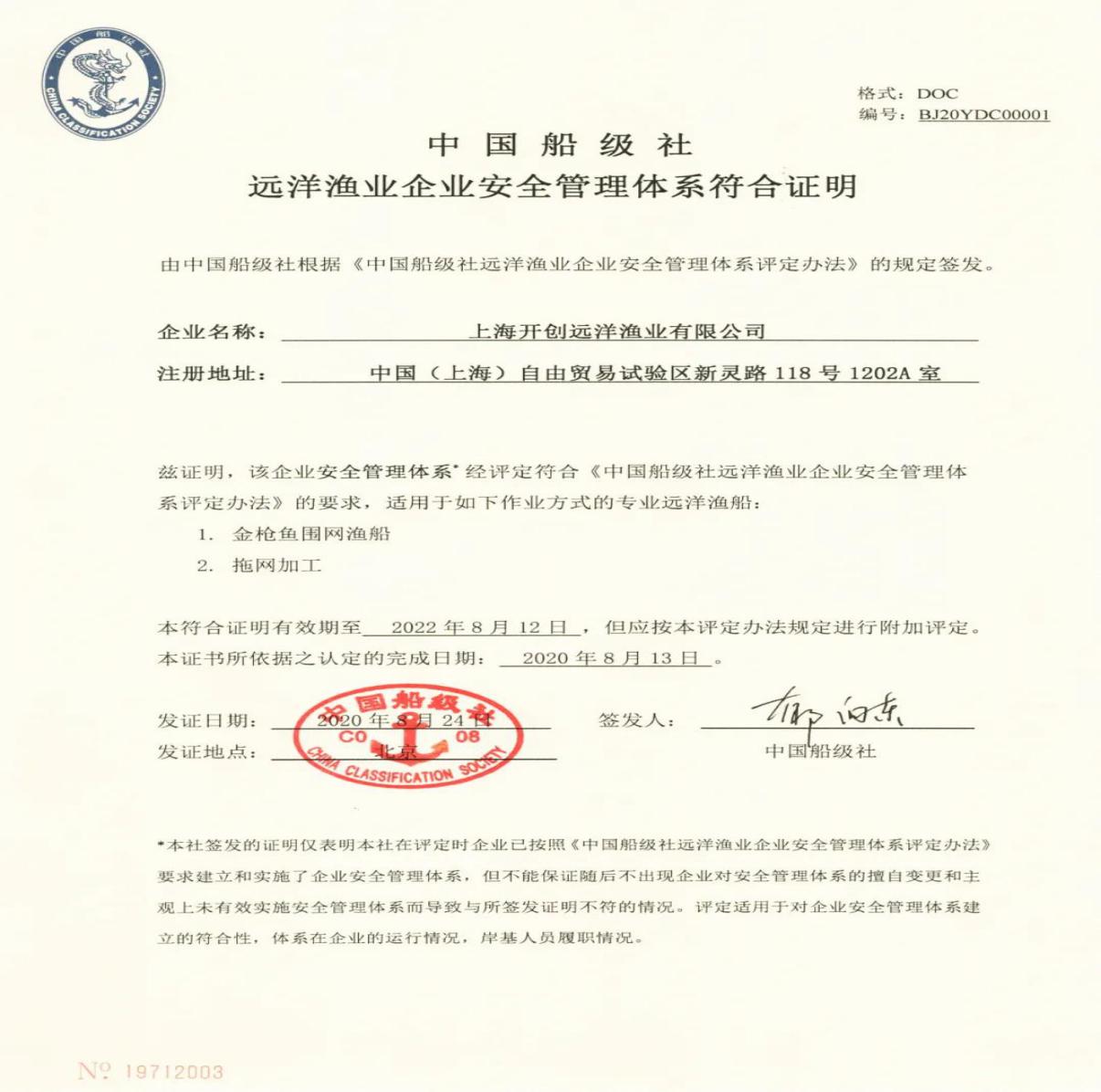 ——顺利通过外部评审。2020年8月14日,安全管理体系顺利通过中国船级社专家组外部评审;25日,获得中国船级社颁发的远洋渔业企业安全管理体系符合证明,填补了中国远洋渔业企业发展史上安全管理体系建设的空白。